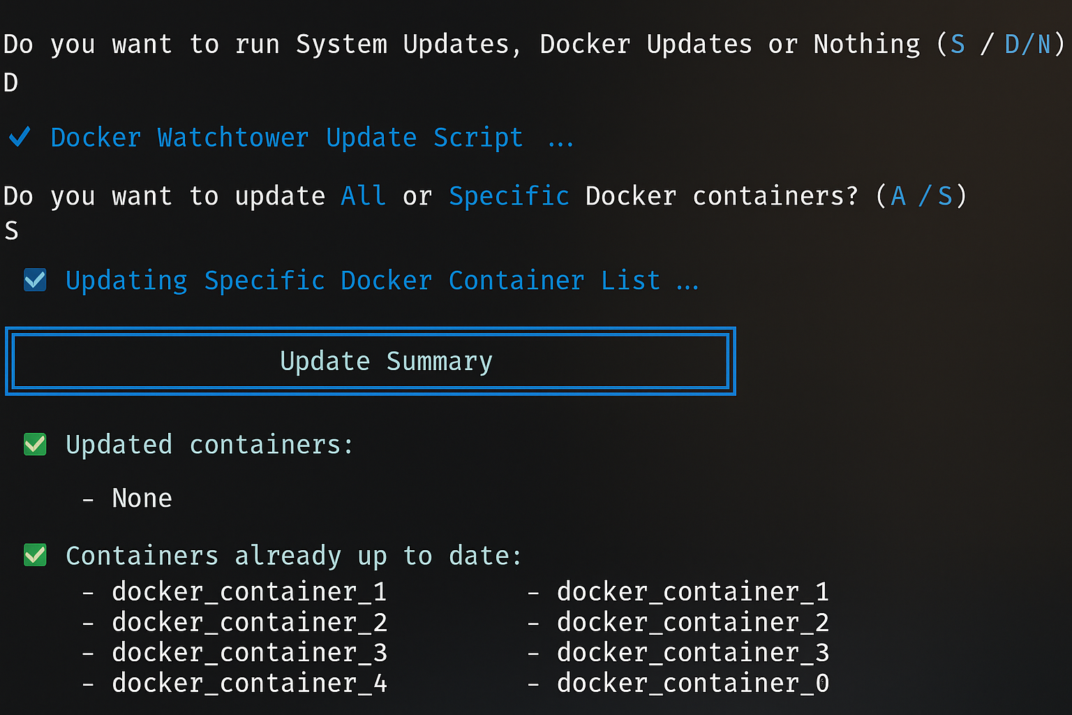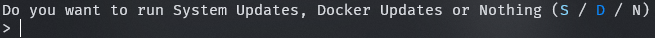 Depending on what I choose, it runs either a system update (S), launches my Docker update script (D), or simply skips maintenance (N). It’s clean, fast, and perfect for routine maintenance sessions.
